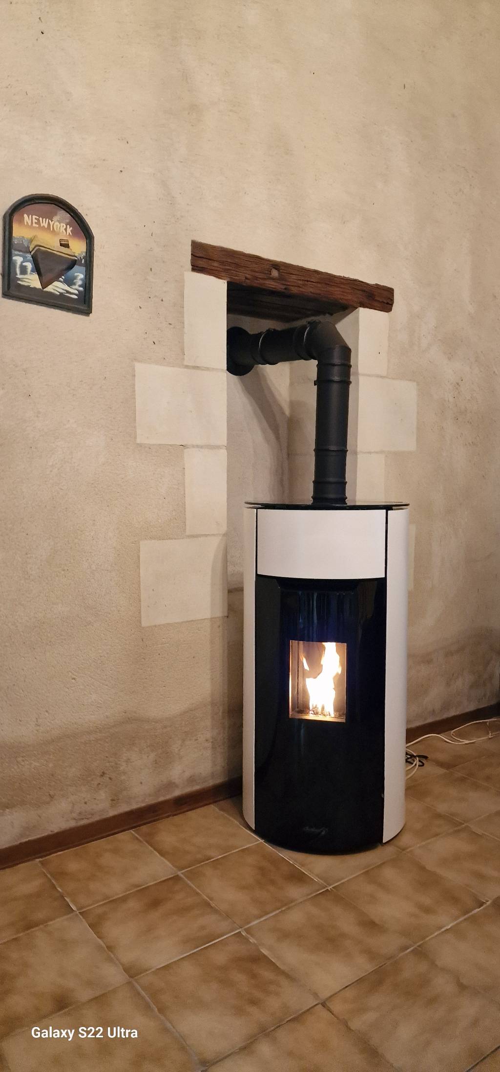 Challenge relevé !! Pose d'un poêle à granulés à ventouse me permettant ainsi d'optimiser le positionnement du poêle afin de chauffer harmonieusement cette pièce de vie et de jeu (billard français).