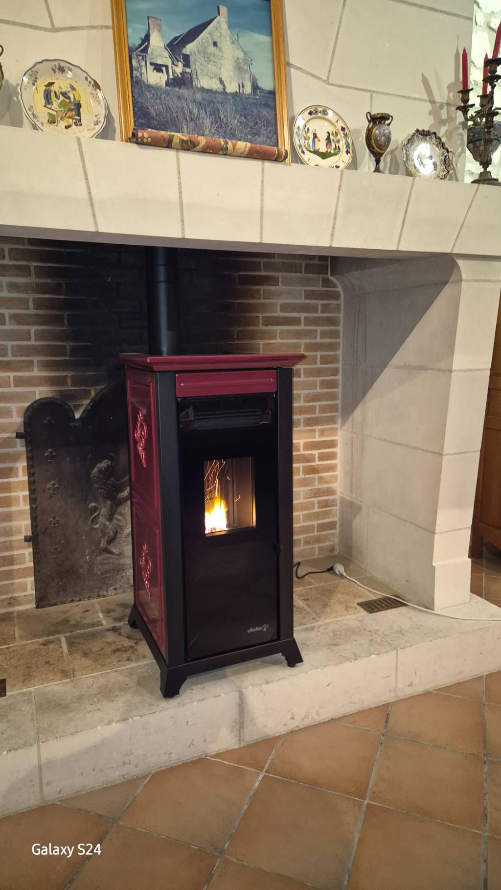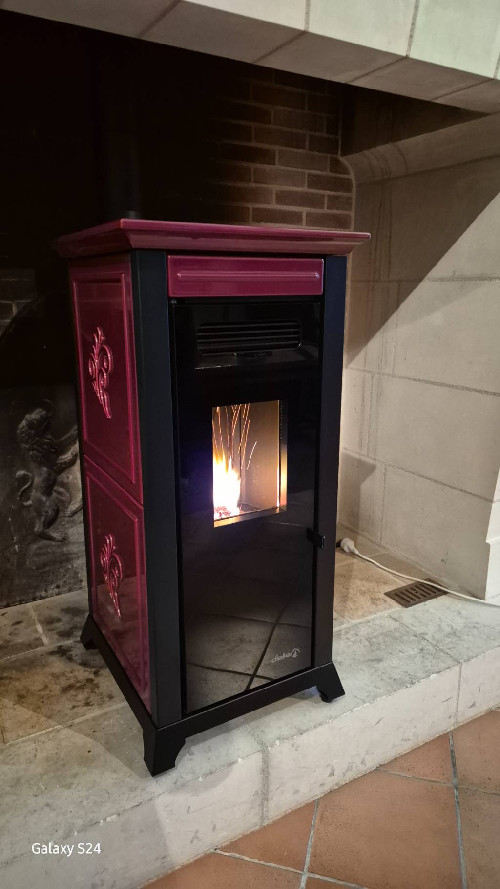 Dernier objectif proposer un poêle avec un design ne dénaturant pas l'esprit de cette cheminée, le modèle ETHESIA de DIELLE d'une puissance de 12 Kw, disposant du foyer volcan pour une flamme plus intense et agréable, une chambre de combustion en fonte plus et biensûr un poêle piloté par wifi via un ou plusieurs smartphone ou directement par la télécommande équipée d'une sonde thermostatique !