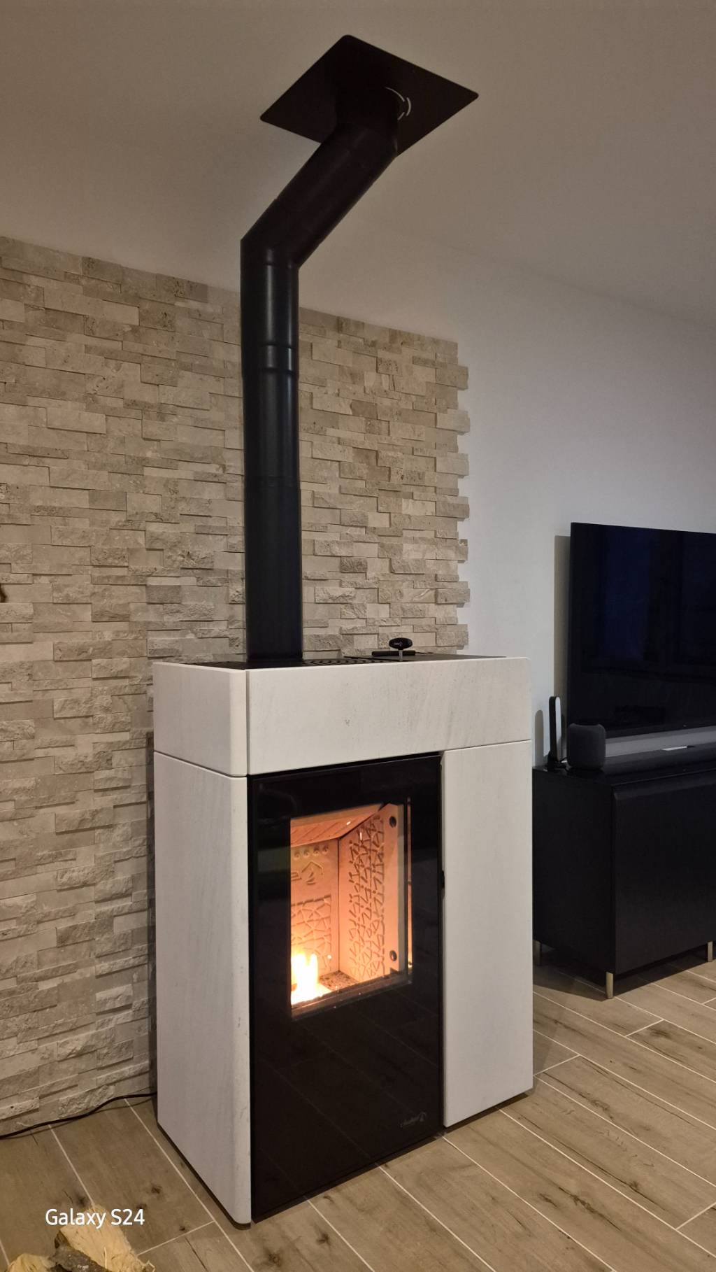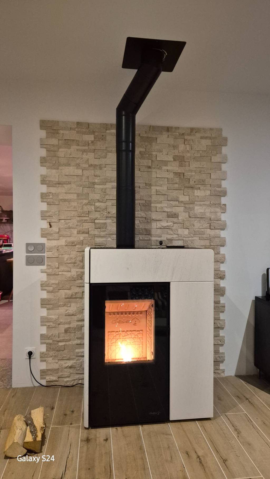 Ils souhaitaient profiter d'une chaleur un plus naturelle et authentique (qu'une pompe à chaleur) et en se protégeant des coupures électriques et cela au rdc de leur maison. En conséquence mes clients ont opté pour un poêle MIXTE (bois et granulés) avec une canalisation (option) à l'arrière du poêle permettant de chauffer la grande cuisine familiale...